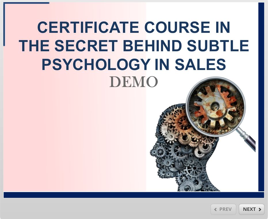 LEARNING OBJECTIVE: The Certificate Course in Subtle Psychology in Sales along with a FREE eBook helps you gain insight into the secrets behind subtle psychology in Sales. This course covers all major components of Subtle Psychology including Cognitivity, Reciprocity, NLP, Hypnosis and embedded commands. If implemented correctly, these techniques can be mighty tools for most salespersons to increase their sales.